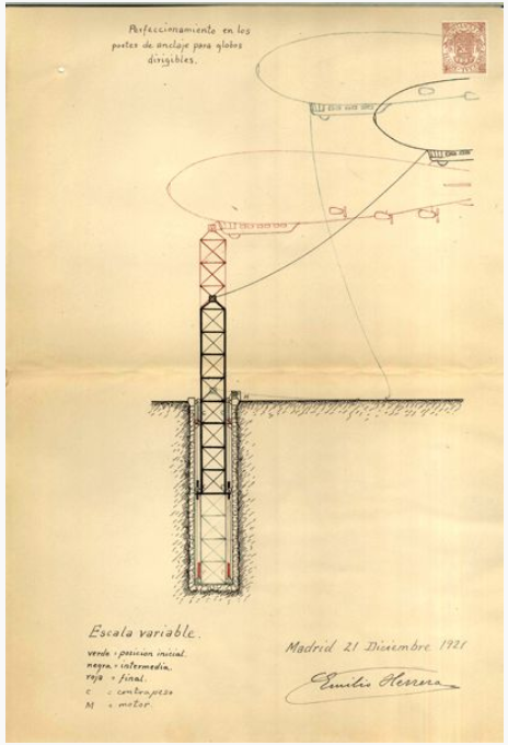 Emilio Herrera fue presidente del Gobierno de la República en el exilio (1960 – 62) pero además ingeniero militar e inventor. Inventó una “escafandra astronáutica”, uno de los primeros antecedentes de los trajes espaciales, como parte de un proyecto para estudiar la estratosfera mediante ascensión en globo. Sin embargo, el proyecto, así como su trayectoria científica se vieron frustrados por el comienzo de la Guerra Civil española en 1936. En el archivo histórico de la OEPM figura como inventor en dos patentes, ambas relacionadas con la aeronáutica: la de número ES127649 y título “Instrumento calculador de características de aviones” y la número ES080315 de titulo “Un perfeccionamiento en los postes de anclaje para globos dirigibles”., una de cuyas figuras se ofrece a continuación: