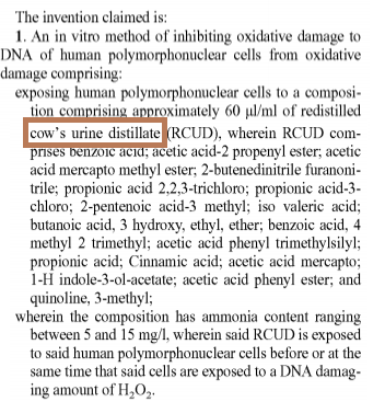 Hinduism is a religion quite unknown in the Western world. However, everybody is acquainted with the fact that cows are venerated by Hindus. Urine from cows is used for therapeutic purposes in ancient Ayurvedic medicine . Patent US7718360 discloses a composition for protecting and/or repairing DNA from oxidative damages comprising redistilled cow’s urine distillate (RCUD) . The description states that cow’s urine is extensively used in Ayurveda for purifying certain materials which otherwise possess toxic properties . It also says that the literature and scripture do not mention urine or its distillate as a protector of cells from DNA damage and chromosomal aberration.