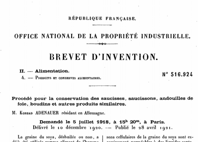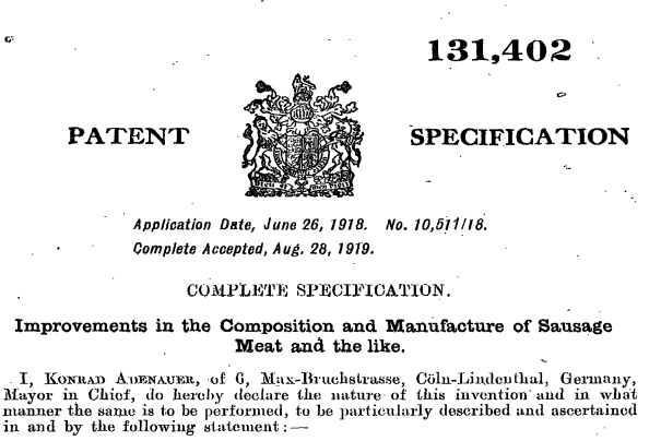 Konrad Adenauer (01/05/1876 – 04/19/1967) was the first chancellor of the Federal German Republic after the war (1949 – 1963). He also was the leader of the CDU (Christian Democratic Union), the main German political party for many years. He led Western Germany to a period of economic prosperity from the ruins of the war. He showed a great inventiveness as well, and patented some of his inventions. For instance, Konrad Adenauer invented the “soy sausages”. Adenauer was the mayor of Cologne during the First World War which was suffering from hunger due to food shortages. One of the difficult to find foods was meat, so he suggested replacing it with soybeans. These sausages were called “Friedenwurst” or “peace sausages”. He is said to have filed a patent application with the German Patent Office and that the patent was refused because this was contrary to the German rules on the ingredients of sausages. Paradoxically, a patent ( GB131402A ) was granted by Great Britain, the enemy, in 1918.