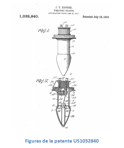 Y al tratar de invenciones con tal fin, las primeras en aparecer patentadas fueron aquellas que combinaban la vibración con dispositivos de masaje. Las primeras publicaciones sobre este tipo de invenciones se detectan durante la segunda década del siglo XX, como, por ejemplo, el documento US1032840 titulado “vibratory dilator” o “dilatador vibrador”. En las primeras patentes de este tipo siempre se hacía referencia a su carácter terapéutico y el placer sexual no se mencionaba en ningún caso.