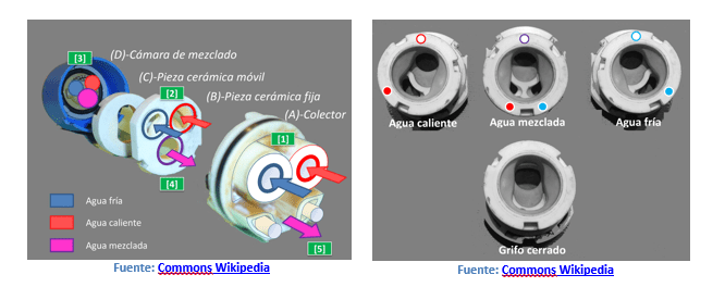 - Una pieza cerámica fija con tres orificios: uno para agua fría, otro para caliente y un tercero para el agua mezclada.