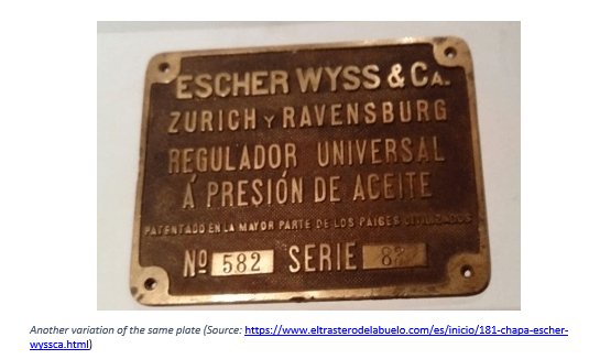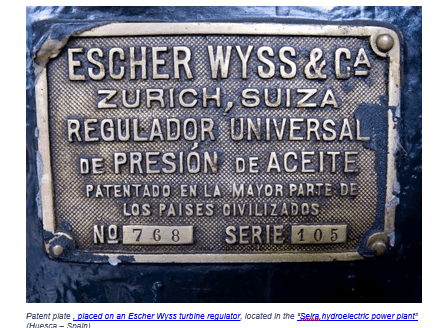 Some of these “patent plates” can be really weird…… like this one, placed on an Escher Wyss turbine regulator, located in the “Seira hydroelectric power plant” (Huesca – Spain): “patented in most civilized countries”. The manufacturer or distributor, seemed to have no doubts about what civilized countries meant. Undoubtedly, it is a very subjective concept. Nowadays it would not be politically correct to publish something like that…..