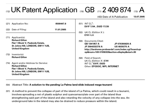 En este artículo se va a realizar un recorrido sobre las patentes que de un modo u otro están relacionados con los volcanes. Parece conveniente comenzar con un documento de patente que hace referencia directa a la isla de La Palma. Se trata del documento GB2409874, que ya en 2006 en el Nº27 de la revista MARCHAMOs protagonizó la sección “patentes curiosas”. Esta patente tiene como título “A solution to the pending La Palma land-slide induced mega-tsunami” (una solución al previsto mega-tsunami causado por una avalancha de tierras en La Palma). Precisamente poco después del inicio de la erupción de La Palma se recordó este asunto, que periódicamente ha aparecido en los medios de comunicación. Esta teoría se basa en que el desplome de una ladera de grandes dimensiones del volcán de Cumbre Vieja sobre el océano Atlántico produciría un tsunami de grandes dimensiones que arrasaría las islas Canarias, la costa de Marruecos y el sur de la Península Ibérica llegando a la costa este de Norteamérica. Afortunadamente, el desastre no se produjo, aunque parece que podría ocurrir en el futuro lejano si se reunieran una serie de circunstancias geológicas desfavorables.