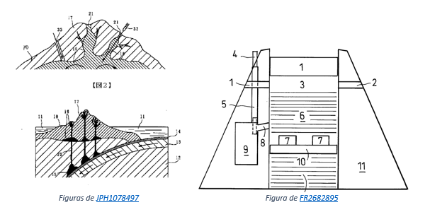 Finalmente, el campo en el que más abundantes son los documentos de patentes es aquel de las actividades destinadas a minimizar los daños provocados por una erupción volcánica. El documento japonés JP2016084691 se refiere aun método para evitar la acumulación de magma y de explosiones volcánicas, que consiste en la inyección a través de una tubería de agua que generará pequeñas explosiones que se disiparán a través de otras tuberías comunicadas con el exterior. Los documentos CN102767171, GB2362410 y RU2057839 divulgan métodos similares.