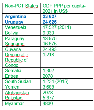 It can be seen that the GDP PPP of Argentina and Uruguay is considerably higher than that of the other non-PCT countries, with the exception of Guyana, a country with a population of about 800,000 inhabitants. It can therefore be concluded that, in terms of economic development, Argentina and Uruguay are an anomaly among the non-Contracting States to the PCT.