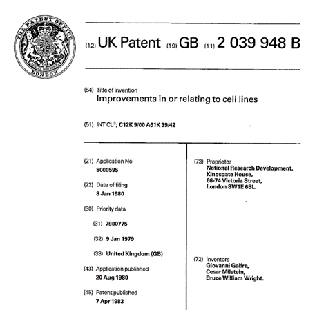 The first patent GB2039948B on technology for obtaining monoclonal antibodies was published in 1980, based on a British priority.