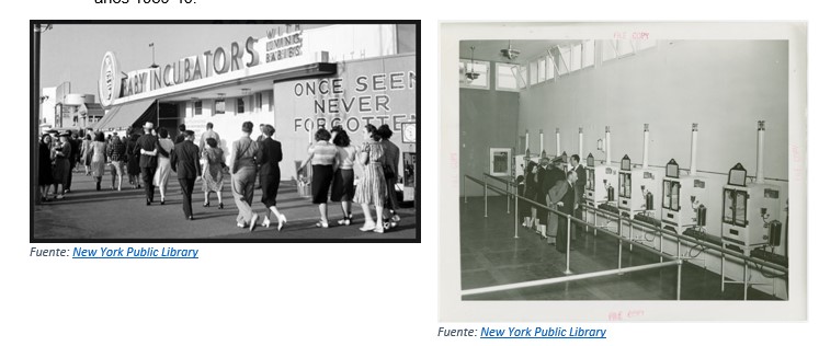Las primeras décadas del siglo XX también fueron testigo de otras invenciones relacionadas con los bebés y sorprendentes cuando se contemplan en 2024.  Ya dediqué una entrada en el blog de la OEPM a las patentes relacionadas con las primeras incubadoras para bebés prematuros y sobre todo a su exhibición en parques de atracciones como una atracción más para el público. Las siguientes fotografías corresponden a la exhibición de incubadoras en la feria mundial de Nueva York de los años 1939-40.