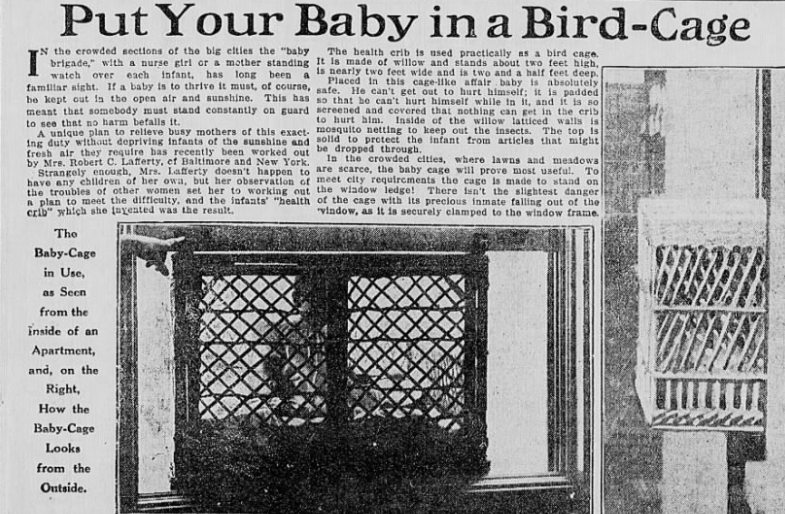 La invención puede resultar muy sorprendente, pero es preciso conocer el contexto, la situación en las ciudades del primer cuarto del siglo XX. En aquellos años, la tuberculosis estaba muy extendida y los padres tenían mucho temor de que sus hijos contrajeran la enfermedad, por ello era común que algunas escuelas tuvieran clases al aire libre. Los médicos insistían en la necesidad de que los bebes estuvieran expuestos al aire fresco y ello era especialmente complicado en las grandes ciudades como Nueva York y Londres, donde la utilización de estas jaulas se popularizó en la década de los 30. El comienzo de la segunda guerra mundial y la “blitz” sobre Londres puso fin a esa práctica.