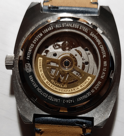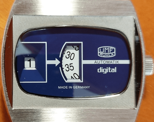 En concreto, se trata del reloj UMF Ruhla 1434-3, con calibre 24-34-2, lo que se conoce como un Scheibenuhr o reloj de discos, también denominado reloj de horas saltantes (jumping hour). En este tipo de reloj, la hora no se muestra mediante manecillas, sino a través de dígitos: el dígito correspondiente a la hora salta cada sesenta minutos, cuando el disco de los minutos completa una rotación de 360 grados.